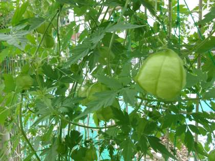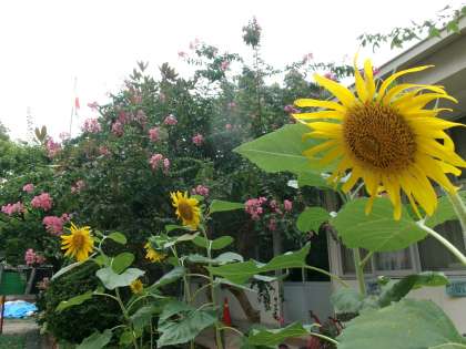 夏休みの間に,みんなで植えたヒマワリやフウセンカズラ、アサガオが綺麗に咲いています。