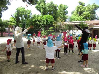 みんなで音楽に合わせ「エイ!ヤー!エイヤーサー!」と体を動かすとたくさん汗をかきました。