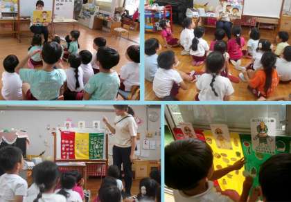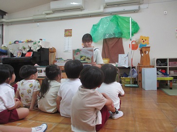 ほし組では、『かけっこ げんきにはしれるかな』という紙芝居を読みました。好き嫌いをせずいろいろな食べ物を食べることで、かけっこで速く走れる丈夫な体になることを話しました。