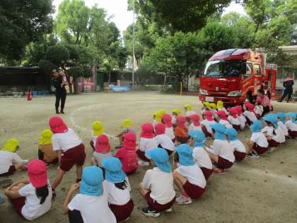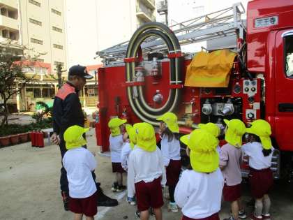 近くで見る消防車に大喜びの子どもたち。じっと見つめる姿や、「このホースは何?」「ここは何のボタンなの?」と消防士さんに一生懸命質問する姿も見られました♪