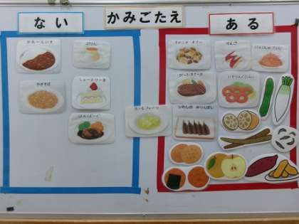 そして、絵本の中に出てきたメニューを噛み応えがあるか・ないかのグループに、みんなで考えて分けました。子どもたちは、「ハンバーグは固いかな?」「ハンバーグは(噛み応えが)ないグループじゃない?」と、食べたときの固さを思い浮かべながら話し合っていました。