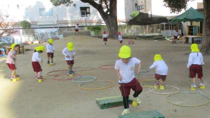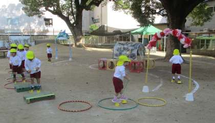 3歳児ほし組の子どもたちは、パカポコを使って毎日元気に体を動かしています。手と足をタイミングを合わせて動かすことがとても難しく、何度も転びながら、立ち上がる姿に成長を感じます。