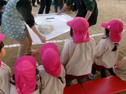 つきあがったおもちを見せてもらい、「うわー!おいしそう!」と子どもたち。