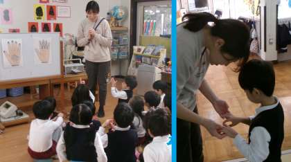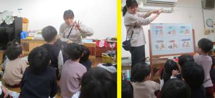 指の間にばい菌が残りやすいことを伝えると、はな組では、「(あわあわてあらいの)おやまのポーズであらわないとあかん」と話していました。