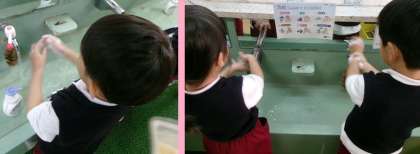 最後は、ばい菌のスタンプを手に押し、スタンプが取れるように丁寧に手を洗いました。ピカピカになった手を嬉しそうに見せる子どもたち。風邪をひかないように、丁寧な手洗いを続けて毎日元気に過ごしましょう!