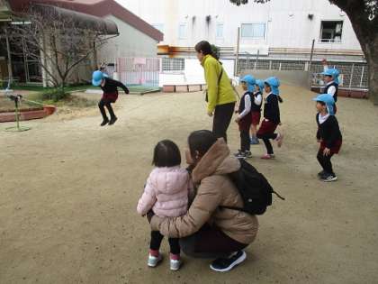 5歳児のお兄さんやお姉さんが大縄跳びで何度も跳ぶ姿を見て、小さいお友達が「すごいねー!」と驚いていました。