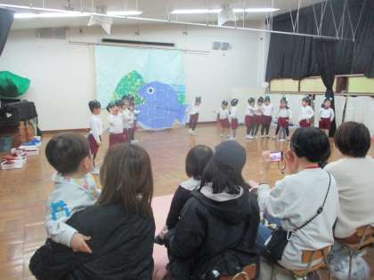 始めは、4歳児はな組が劇遊びを見せてくれました。11ぴきのねこのお話をとても楽しんで見ていました。