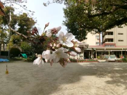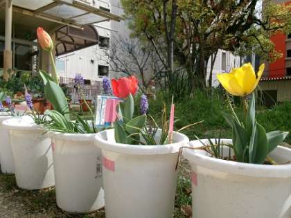 幼稚園の桜や昨年度植えたチューリップの花が開き始めています。