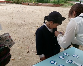 一つ大きい組になり、新しい名札をつけてもらい嬉しそうな子どもたち。