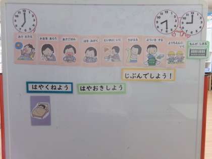 また、朝の行動をきちんとして、幼稚園に遅れずに来るために、「早寝・早起き」が大切なことを確認し、幼稚園の準備や着替えなど自分でできることはやってみようという話もしました。