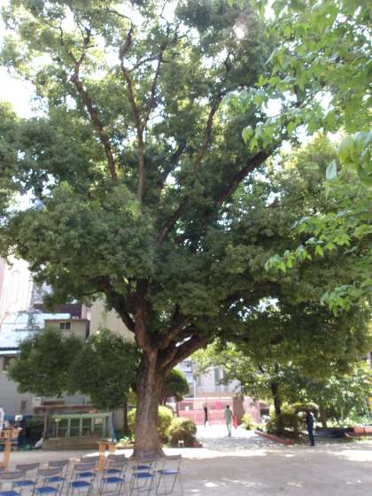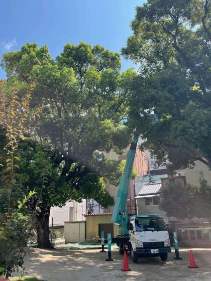 いつも幼稚園を見守ってくれているクスノキを、今日と明日で剪定してもらいます。