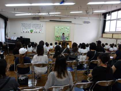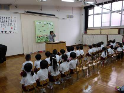 始業式では園長先生の話を聞いたり、みんなで歌を歌ったりしました。久しぶりにみんなで声を合わせて歌って楽しかったですね!