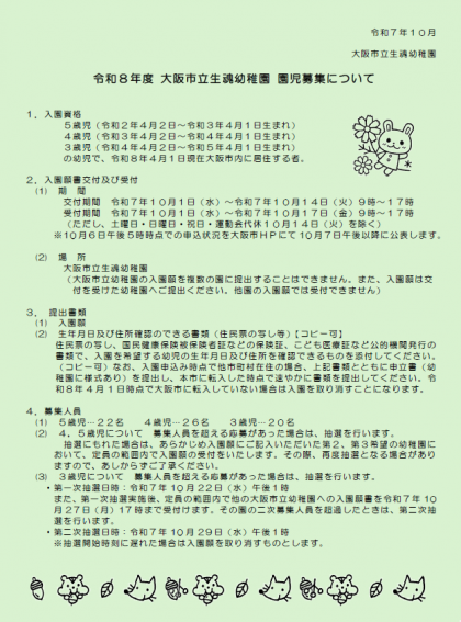 令和8年度の園児募集が始まります! 公開日 2025/09/12 更新日 2025/09/12 お知らせ 令和7年度10月1日(水)より、令和8年度入園願書の交付・受付が始まります。 入園を考えられている方は、期日内に入園願書の交付・受付をしてください。 未就園児活動のページにも、写真と同様の募集要項を掲載しておりますので、ご覧ください。 また、気になることや園見学などにつきましては、生魂幼稚園へご連絡ください。 お待ちしております。 いいね(0)