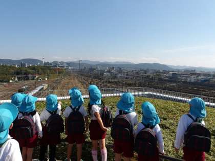 とってもいい天気の中、バスでは新幹線や飛行機が見えたり,クイズや歌を楽しんだりしているうちに、あっという間に京都鉄道博物館につきました。