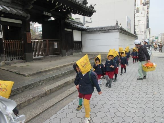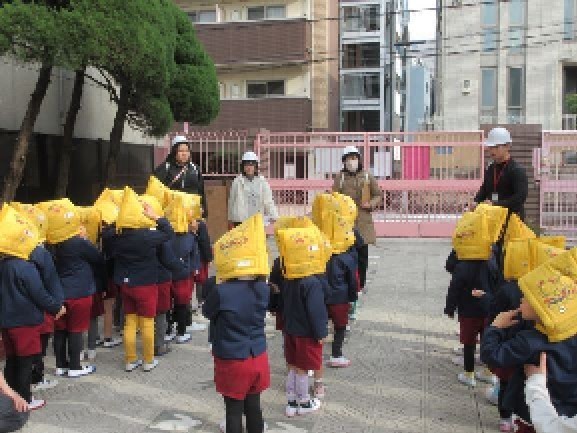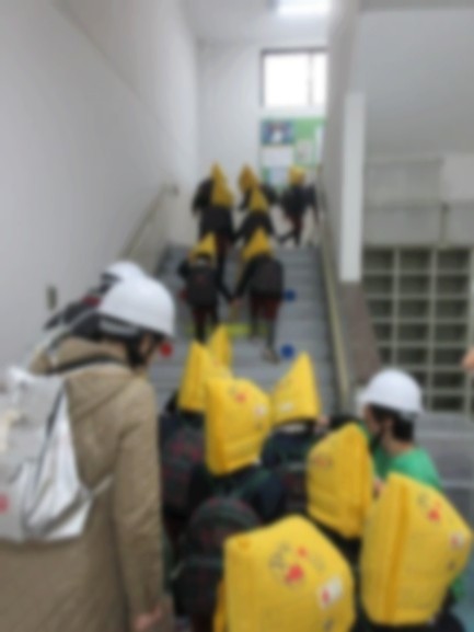 幼稚園で避難訓練後、全園児が生魂小学校の先生方にご協力をいただき、3階まで避難しました。