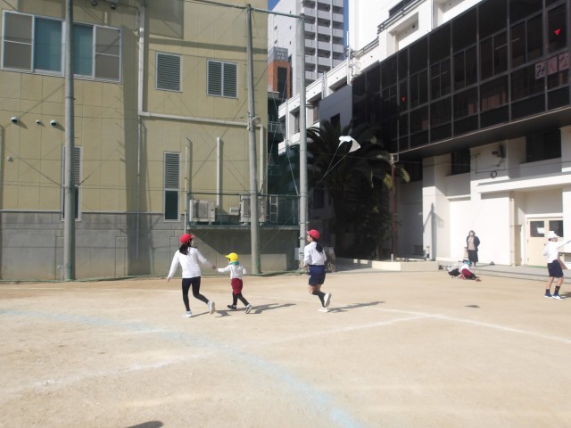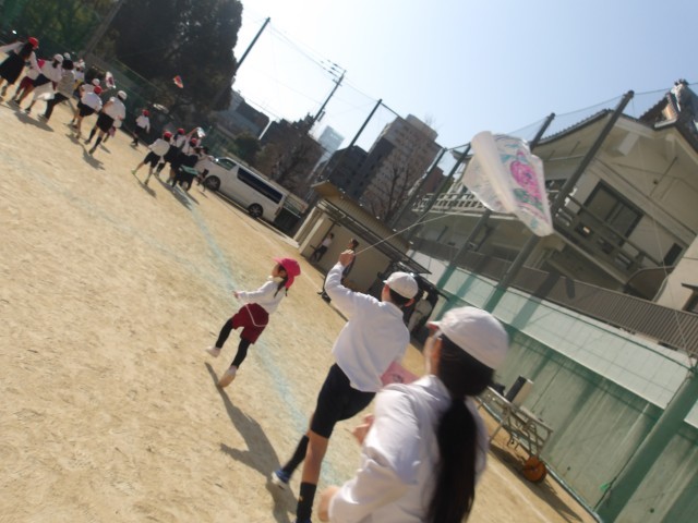 今日は生魂小学校へ行き、5年生のお兄さん・お姉さんと一緒に凧あげを楽しみました。