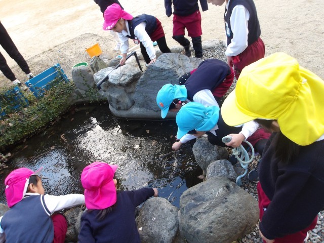 先日、園庭の池にうっすらと氷が張っているのを見つけ、登園してきた子どもたちは大喜び。「こおりになってる!」と興味津々の様子でした。実際にそっとふれてみると、「つめたい!」と驚いたり、不思議そうにじっと見たりと、それぞれが冬の自然を感じていました。寒さに負けず、これからも外で沢山遊びながら、冬ならではの自然現象にふれていきたいと思います。