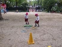 昨日、そら組のお兄さん、お姉さんたちが、フープやコーンなどを使ってサーキット遊びをしていました。それを見たはな組さんも、「やってみたい!」と今日は自分たちで並べて遊んでいました。
