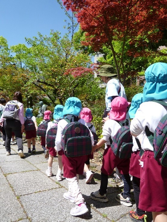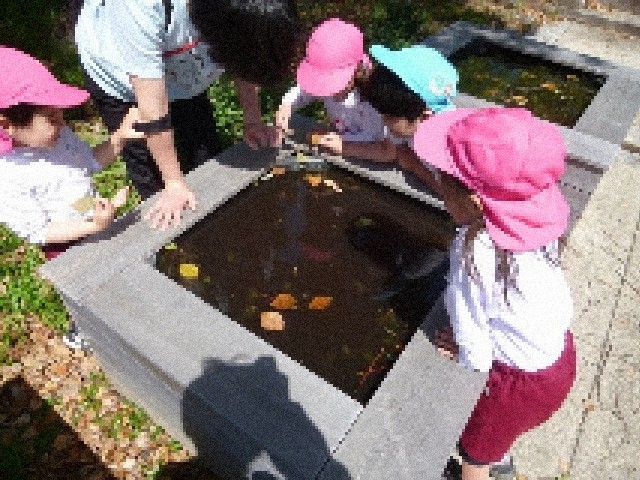 やわらかな日差しの中、木々に囲まれた自然豊かな環境の中で、子どもたちは草花や虫を見つけたり、鯉を見たりして、思い思いに楽しむ姿が見られました。