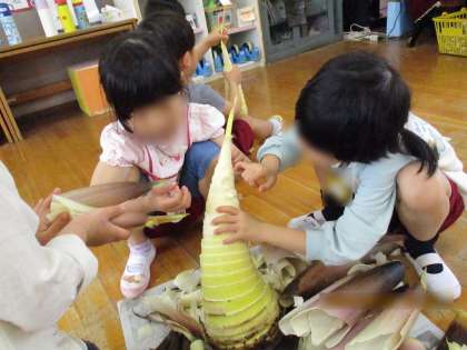 朝登園して、竹とタケノコを見つけた子どもたち。「先生見て、何かある!」「これ何?」「夜の間に生えたんちゃう?」「見たことある」など興味津々でした。