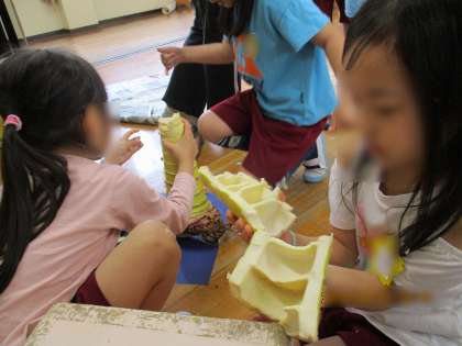 「じゃ、白色の中はどうなっているんだろう?」と大積木の角に打ち付けて割って調べたり、剥いた皮を使って帽子や爪にして遊んだりと、たくさんの事を知ったり気付いたりして遊びました。