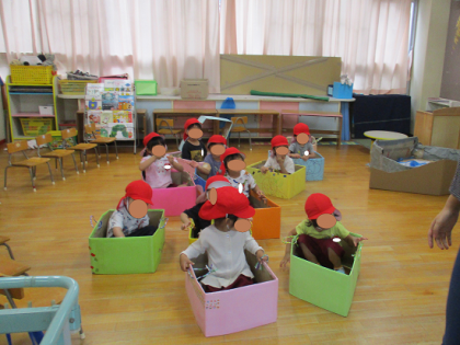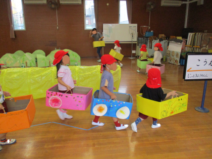 子どもたちは電車にのると「山に行こう」と電車ごっこがはじまりました。