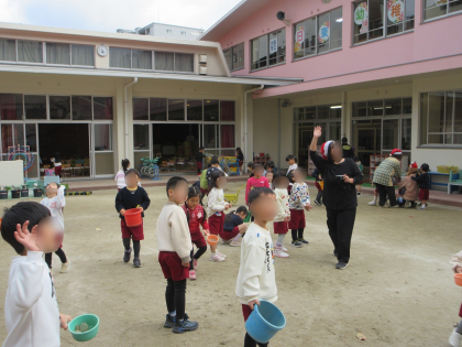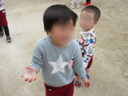 サンタさんが帰った後の園庭を見ると、「サンタさんの氷や」「そりの後もあるよ」