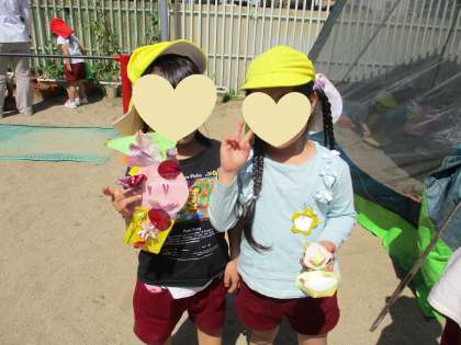 またお花を使った遊びでは画用紙、テープを子どもたちが手に取りやすいところに置くと年長児を中心に遊びを進めていきました。動物をつくったり、お化粧道具をつくったりして楽しんでいます。(2枚目)