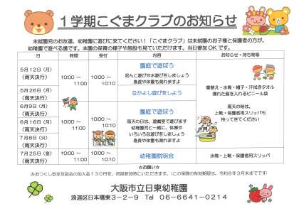 令和7年度 こぐまクラブについて 公開日 2025/04/24 更新日 2025/04/24 こぐまクラブ 令和7年度の『こぐまクラブ』についてのお知らせです。1学期は5月12日より始まります。 未就園児のお友達は、どなたでも幼稚園に来ていただけます。是非、遊びに来てくださいね♪ いいね(0)