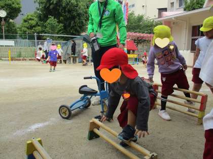 さくら組(4歳児)がエス棒でつくったジャンプコースで遊んでいると、きく組(5歳児)がやって来て大ジャンプを見せてくれました。その姿を見て、さくら組の子どもたちも「やってみる!」とエス棒を高くして挑戦!その姿を見ていたうめ組(3歳児)も、体を小さくしてそーっと足を上げて挑戦♪