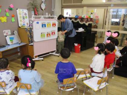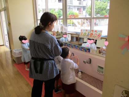 みんな、真剣な表情で話を聞いていましたよ。話の後『てあらいのうた』に合わせて実際に手洗い場で手を洗ってみました。手洗いの仕方の写真を見て、歌を口ずさみながら丁寧に洗っていました。