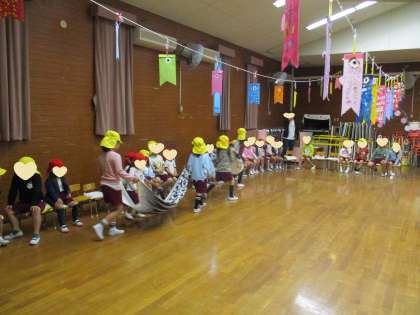 普段は屋根より高くあがっているこいのぼりを、目の前で見て触れて、とても嬉しそうでした。うめ組(3歳児)とさくら組(4歳児)はかけっこ、きく組(5歳児)は折り返しリレーで遊びました。走る時も友達を応援する時も力いっぱいのきく組の子どもたちでした。