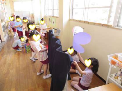 きく組の子どもたちのペープサート遊びが始まりました。「ネコがきたよ!」「つかまっちゃう!」など、友達と一緒にイメージを膨らませながらやり取りをして遊ぶことを楽しんでいました。