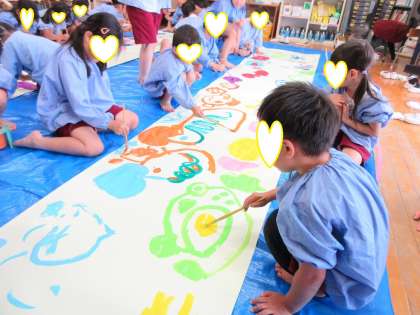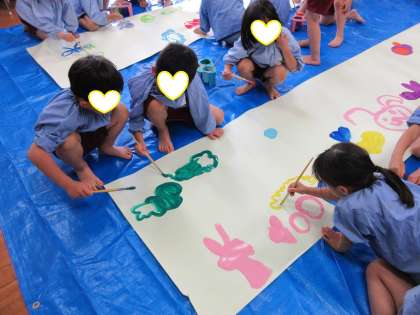 絵の具を使って大きな紙にみんなで絵もかきました。「見て!〇〇くんと一緒にワニかいたの!」と、友達と共通のイメージをもって一緒にかくことを楽しんでいる子どもや、自分がイメージしたものを伸び伸びと表現してかくことを楽しんでいる子どもいました。