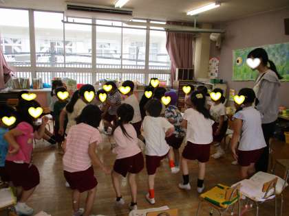 幼稚園に帰り、中学校の運動会を見せてもらったことをクラスでふり返りました。