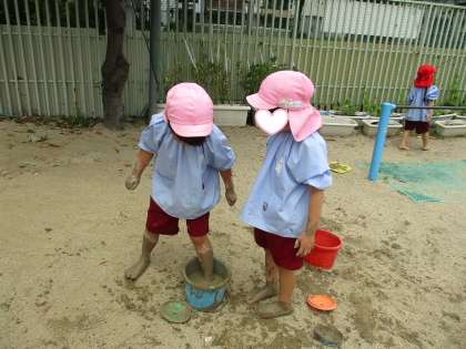 さくら組(4歳児)も、きく組の遊びを見て、とろとろの泥になる場所を発見していました。その泥をバケツいっぱいに集めてそーっと足を入れて「気持ちいい!見て!靴下みたい!」と、手だけでなく足でも存分に感触を楽しんでいました。うめ組(3歳児)は、年長・年中児の遊びの様子を見ながら、自分の安心するいつもの場所で、先生や友達と一緒にバケツに砂と水を入れて泥や泥水をつくって「はい!ジュースどうぞ♪」と見立て遊びをしたり、水や泥の感触を楽しむ姿が見られます。