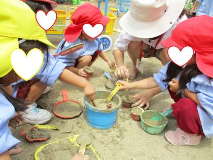 晴れた日は、園庭で泥遊びを楽しんでいます。きく組(5歳児)は、砂と泥の感触の違いに気付き、「ここの砂がいいよ!」と友達と一緒にふわふわでとろとろの泥がつくれる場所を探したり「ふわふわのお団子ができたの。触ってみて!」と、いつもとは違う場所でつくった泥だんごの感触がふわふわになったことが嬉しくて教師に伝えにきてくれたり、自分たちで好きな遊びを見つけて楽しむ中で、自然の不思議さを感じ、考えて試したり、発見したりする様子が見られます。