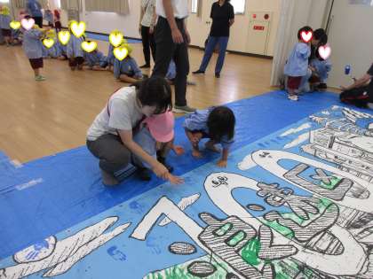 この横断幕は、幼稚園・小学校・中学校が協力して制作します。横断幕の中心部の絵は、日本橋中学校の美術部のみなさんが作成してくださいました。そして小学校の生徒さんの手形も加わり、最後に日東幼稚園の子どもたちの可愛い手形もたくさん加わりました。地域の一員として参加する経験を通して、子どもたちにとって、この浪速区の街がより身近になり、親しむ気持ちも大きく膨らんだのではないかと思います。