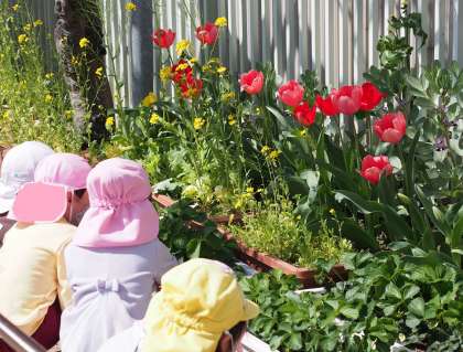 幼稚園の庭では、子どもたちが植えたチューリップの花がきれいに咲きました。