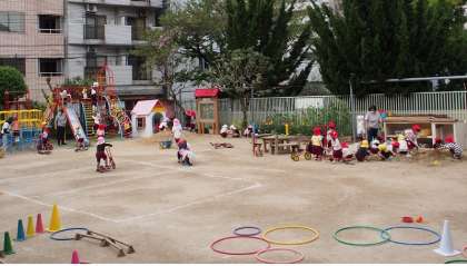 3歳児、4歳児、5歳児みんな一緒に、お庭で好きな遊びを楽しんでいます。