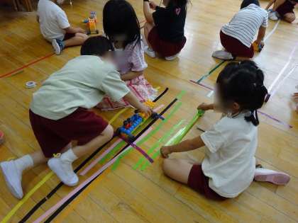 毎日、ビニールテープを使って、線路を長くしたり、新しい道をつくったりしています。