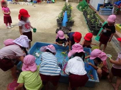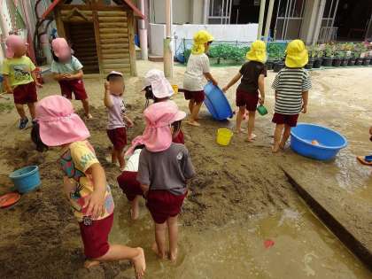 スーパーボールすくいや、どろんこ遊びをして、「お水、冷たくて、気持ちいいね」と喜んで遊んでいます。