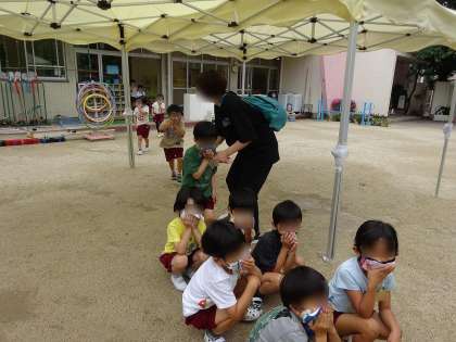 非常ベルの音を聞くと、すぐに先生のところに集まり、放送をよく聞いて、園庭に避難しました。