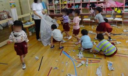 4歳児 新聞紙で遊んだよ 公開日 2022/06/15 更新日 2022/06/15 幼稚園日記 今日は、新聞紙で忍者の修行をしました。 新聞紙の布団をかけて・・・ 「かくれんぼの術!」 新聞紙をビリビリ破ると・・・ 「引っ張って破ったら、びっくりする音(『パンッ』という音)がするよ!」 「お米くらい、小さくちぎれるかな」 また今度、修行をするので、大きな袋に新聞紙を入れて・・・ 「お片付けの術!」 いいね(0)