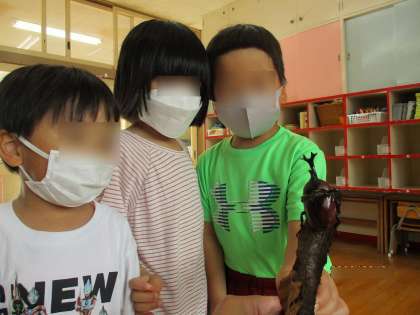 ともだちひろば(預かり保育)の子どもたちが、「かっこいいね」「つかめるようになったよ」「ゼリーいっぱい食べてね」と、大事にお世話しています。