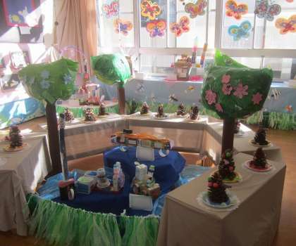 子どもたちが、日ごろからかいたり、つくったりしている作品をお家の人に見てもらいました。