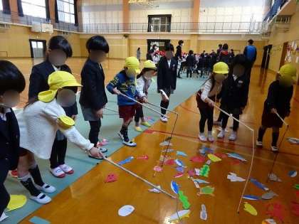体育館で、1年生が準備してくれたお店でゲームをして遊びました。遊び方を優しく教えてくれました。「1年生がつくってくれたゲーム全部楽しかった」と大喜びでした。