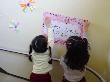 お祝いのお花やお手紙、輪飾りをつくったさくら組(4歳児)。