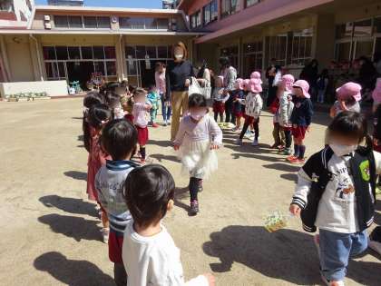 新入園児1日入園をしました(その2) 公開日 2023/03/20 更新日 2023/03/20 幼稚園日記 遊戯室では、 『♪パンダうさぎコアラ』の手遊びをしたり、 『♪日東幼稚園の歌』を歌ったりしました。 新しいお友達が帰るときは、 うめ組とさくら組が 「また来てね」 「バイバイ」 とお見送りしました。 新しいお友達は、 手を振ってもらい、嬉しそうでした。 うめ組とさくら組は、 新しいお友達と一緒に遊び、 進級への期待につながっていたようでした。 いいね(0)