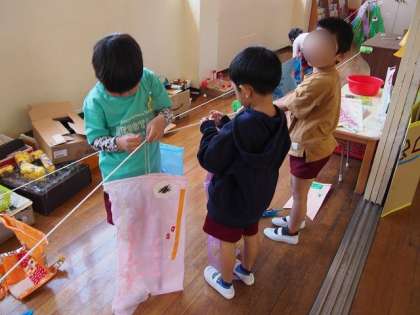こどもの日の集いの準備 公開日 2023/05/01 更新日 2023/05/01 幼稚園日記 5歳児が中心になって、「こどもの日の集い」を楽しい一日にしようと考えてきました。 「みんなのこいのぼり、全部飾ったらいいんじゃない」「きく組(5歳児)が先生になって、みんなで体操しようよ」「うめ組さん(3歳児)とさくら組さん(4歳児)に、招待状渡そうよ」とみんなで準備を進めてきました。 きく組から招待状をもらった、うめ組・さくら組も大喜びでした。 明日の「こどもの日の集い」が楽しみですね。 いいね(0)
